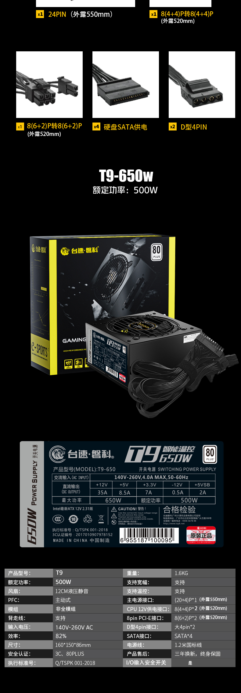 臺(tái)速磐科T9-650主動(dòng)式80PLUS額定500W背走線靜音溫控節(jié)能防雷臺(tái)式機(jī)3C安規(guī)電腦開關(guān)電源